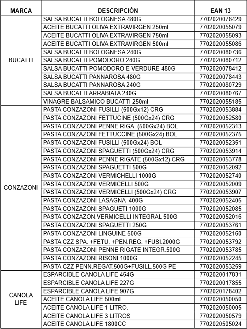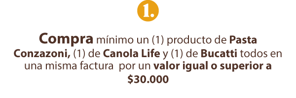 R/ La ACTIVIDAD va dirigida a los consumidores (personas naturales) mayores de edad que compren como mínimo un (1) producto de cada una de las Marcas Participantes las cuales son: 1 producto de Aceites y Esparcibles Canola Life, 1 producto Pastas Conzazoni y 1 producto Bucatti.