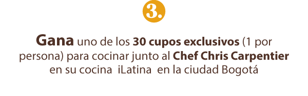 R/ Los ganadores que ocupen el puesto 1 al 30 se ganaran un cupo sencillo para disfrutar de una experiencia culinaria exclusiva presencial con las marcas participantes la cual se realizará en la ciudad de Bogotá D.C. Nota: Experiencia de Cocina con Chris Carpentier en la Cocina ILATINA en la ciudad de Bogotá, el día 23 de Mayo La Organizadora asumirá los gastos de traslado de los participantes ganadores desde ciudades principales Cali, Medellín, Barranquilla, Cartagena, Pereira, Bucaramanga, Pasto y Cúcuta, en caso que el participante ganador se encuentre en un municipio cercano a la ciudad principal deberá asumir el traslado tanto de ida como de regreso hasta el aeropuerto señalado por la Organizadora en el cual saldrá el transporte para llevarlo a disfrutar del premio a la ciudad de Bogotá D.C, el Participante ganador exime de todo tipo de responsabilidad y reclamo a la Organizadora en el evento que por hechos endilgables a su responsabilidad no se presente en el horario y fecha señalados en el aeropuerto.